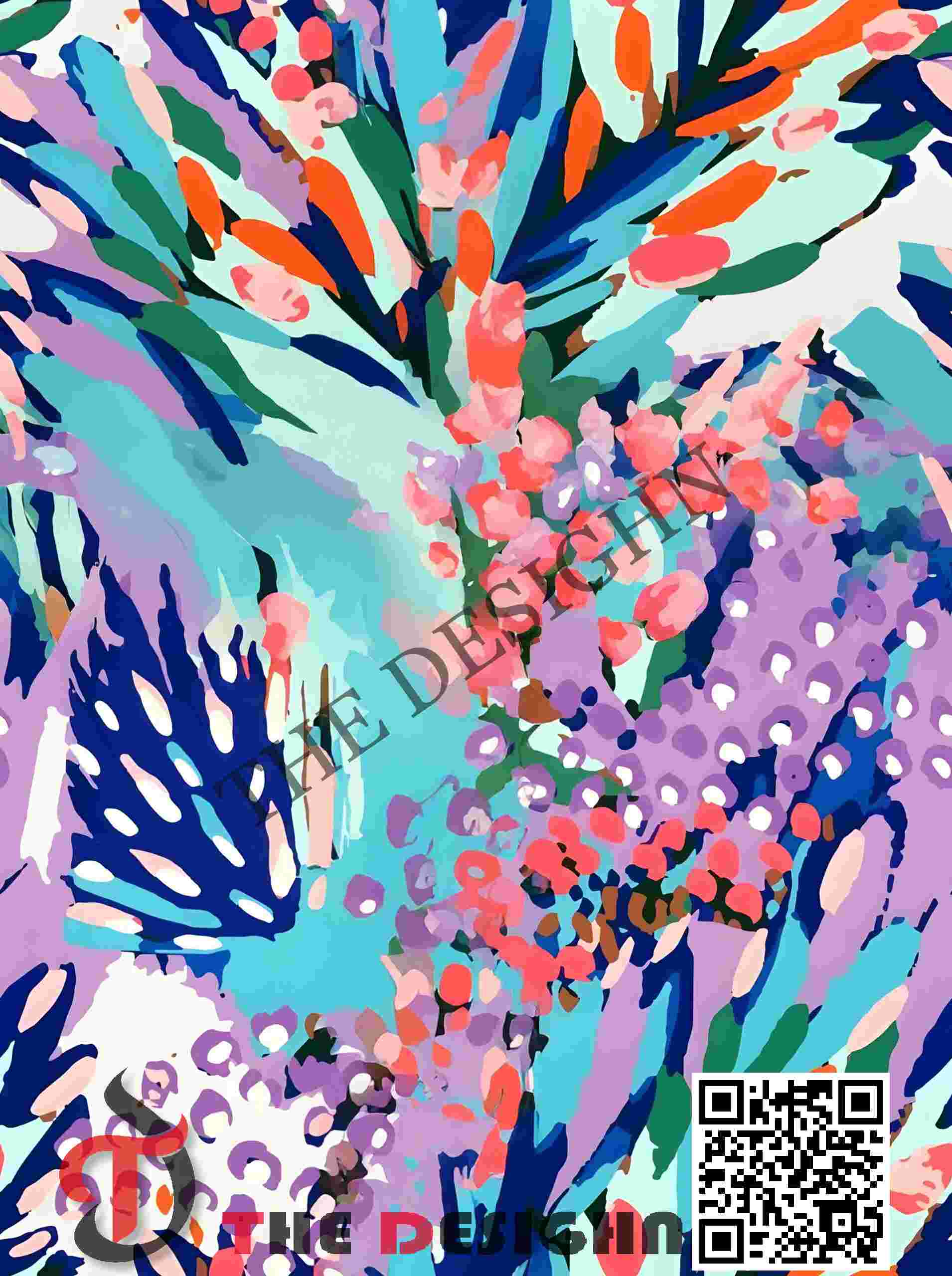 Edge Dispersion (Frayed-to-Sharp): The boundaries of the forms feature a “Hybrid Transition.” While the background utilizes a soft, vaporous dispersion to create depth, the primary gestural specimens (like the blue fronds) maintain a sharp, graphic dispersion to define their architectural shape, ensuring the motifs feel hand-rendered rather than mechanically generated.