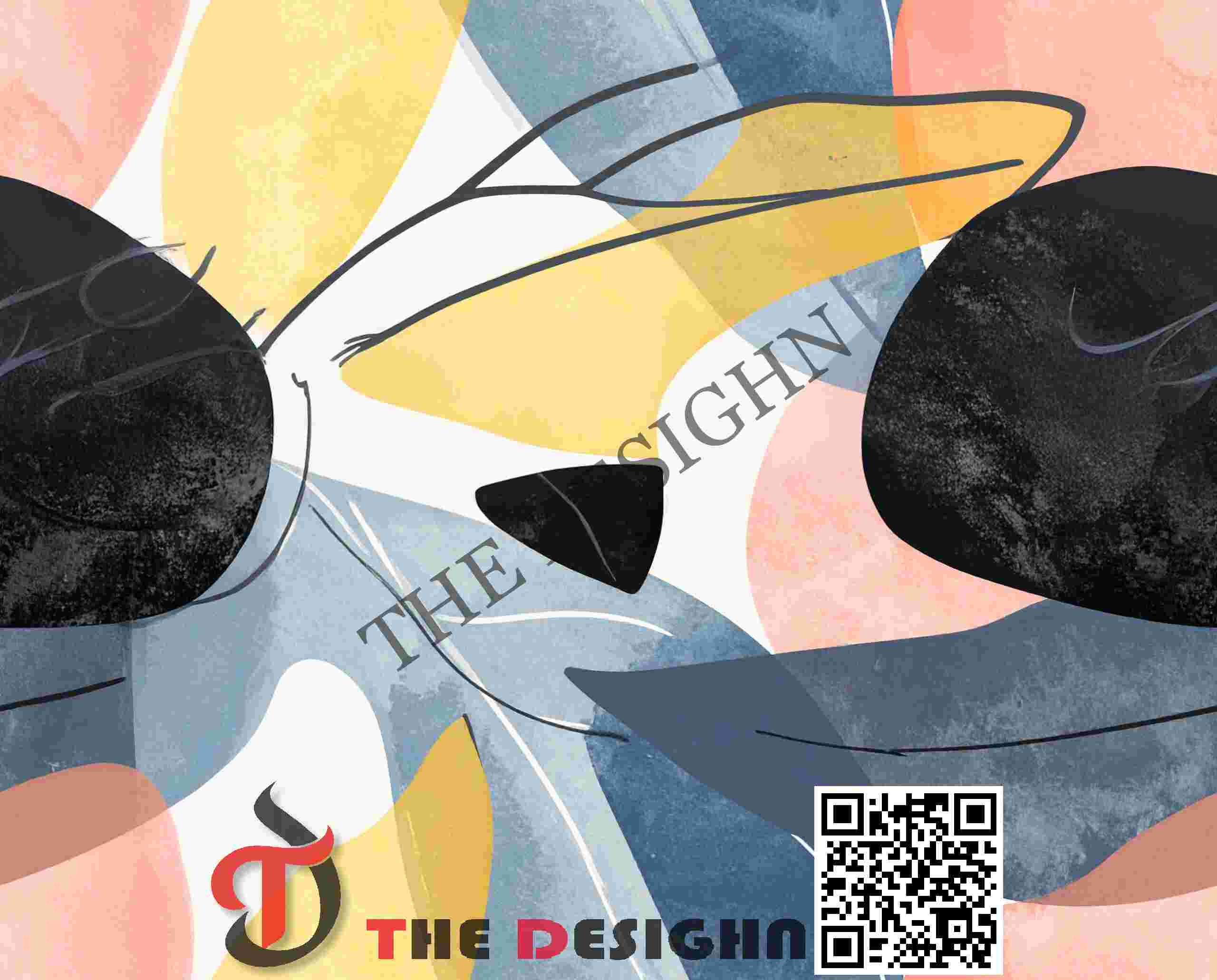 • The Look: The composition utilizes “Spectral Mass Layering.” Set against a brilliant Mineral-White field, the design features translucent shapes in Slate-Blue, Lemon-Yellow, and Candy-Pink. Large, charcoal-black “obsidian” nodes act as structural weights, while fine ochre and black line-work provide a kinetic, skeletal framework.