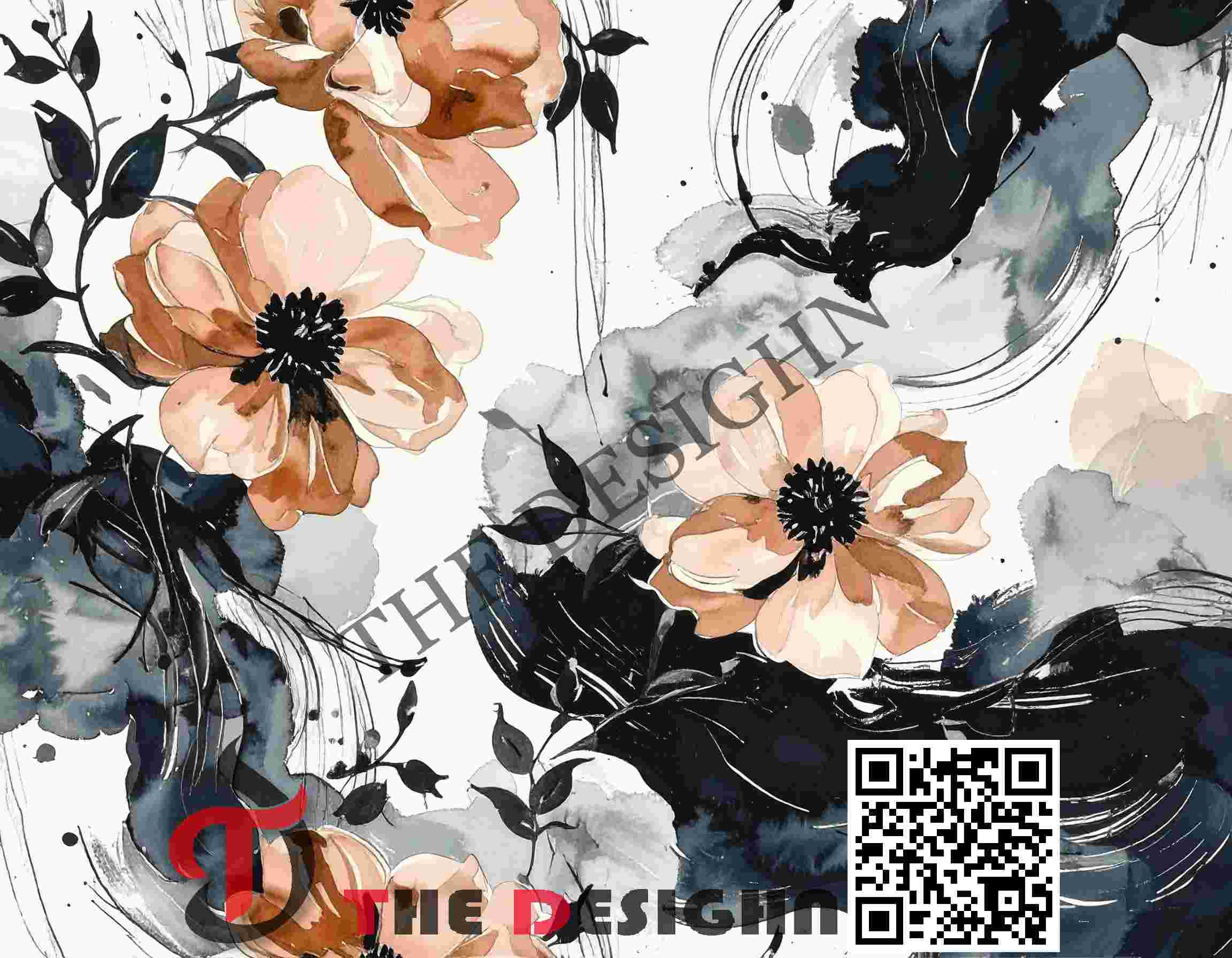 • The Look: It features relatively clean, peach-colored flowers floating over a background of heavy, sweeping dark ink washes. The background looks like stormy skies or rushing water.
