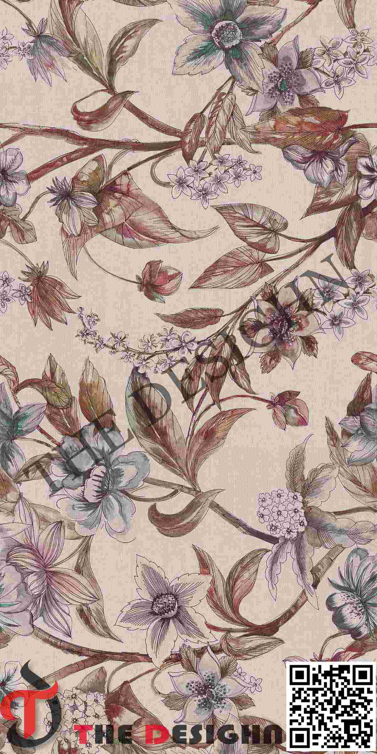 • The Look: The composition utilizes “Material Layering.” The background features a visible “slub” texture characteristic of high-quality linen. The flowers are rendered with soft, translucent washes of terracotta, plum, and ochre, anchored by delicate, slightly “bleeding” ink outlines.