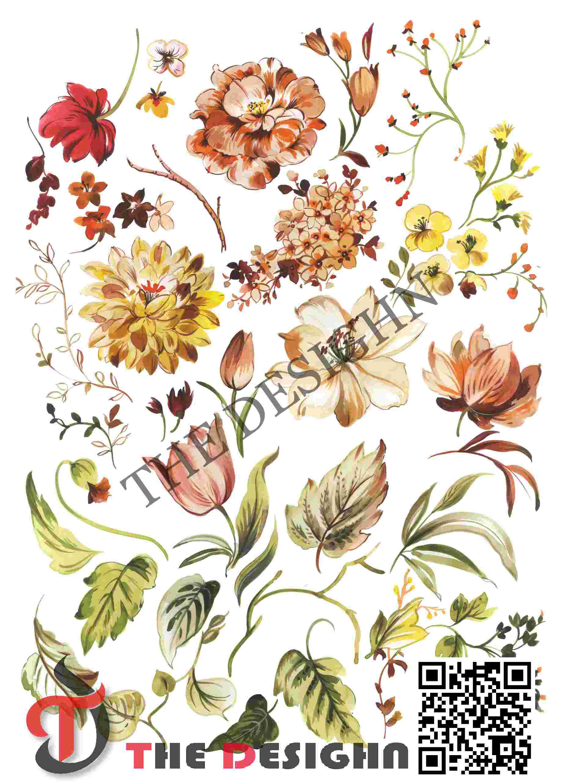 Pigment Dispersion (Zonal): The design features “Viscous Zonal Graduation.” Dispersion is strictly organized by the “radial” structure of the blooms and the “ribbed” structure of the leaves. The color exists in a state of high-density saturation at the core of the marigolds and tulips, immediately transitioning to a lower density and higher transparency at the tips, mimicking the natural movement of liquid pigments meeting a drying mineral surface.