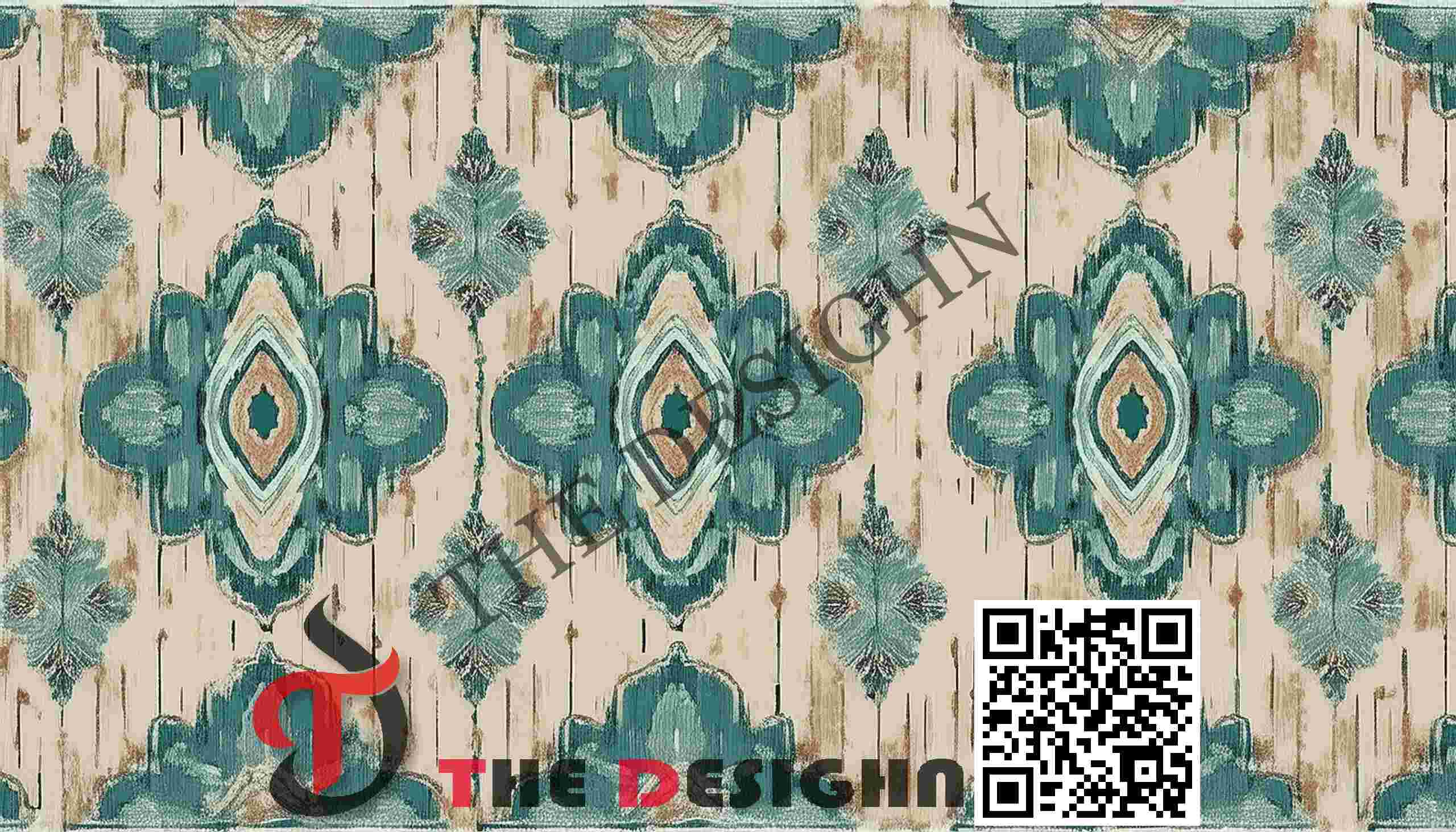 • Visual Dispersion (Vaporous): The primary teal and green color zones exhibit “Vaporous Tonal Bleeding”. The pigments are dispersed in soft, feather-edged “currents” that suggest a high-dilution watercolor technique, providing a sense of immense soft-focus depth that mimics the natural bleed of hand-dyed Ikat fibers.
