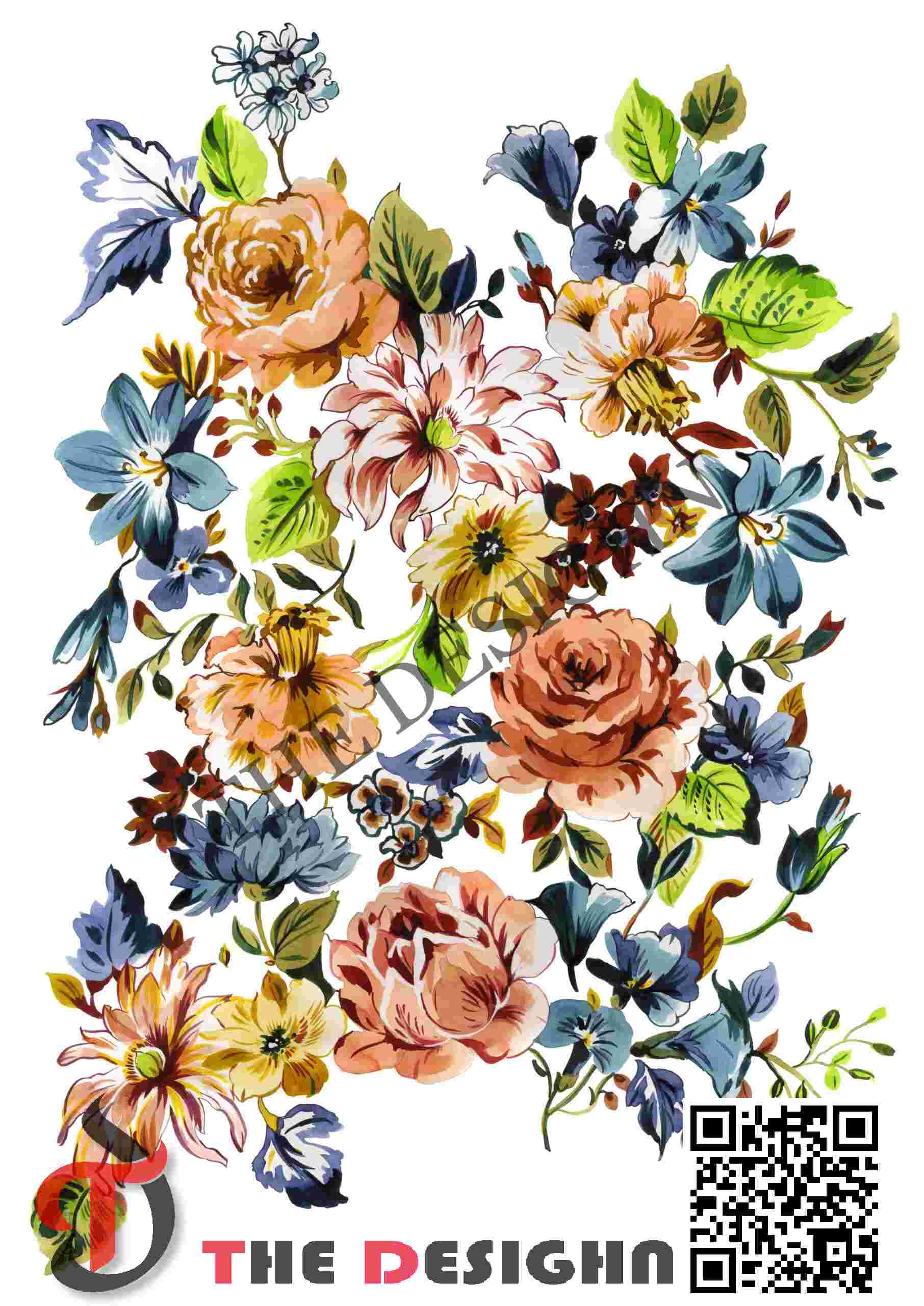 Pigment Dispersion (Zonal): The design features “Viscous Zonal Graduation.” Dispersion is strictly organized by the “radial” structure of the blooms. The color moves from high-density, opaque orange and blue centers to light, vaporous “washed” tints at the petal tips, mimicking the natural movement of liquid pigments meeting a drying mineral surface.