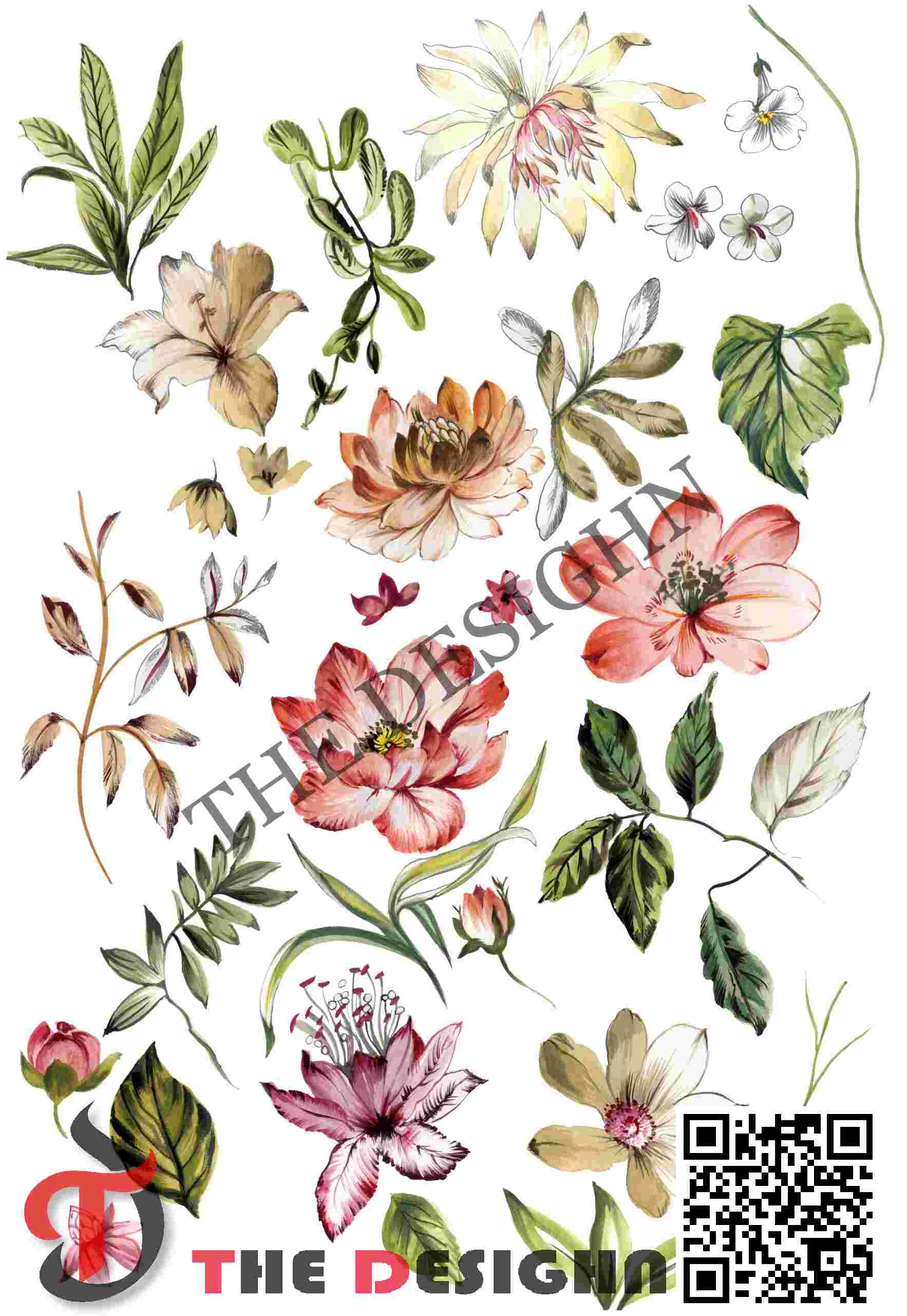 • The Look: The composition utilizes “Distributed Specimen Scaffolding.” Set against a brilliant Mineral-White field, the design is anchored by an upper cluster of pale-citrine and toasted-amber blooms. The lower half transitions into more saturated rose-quartz and fuchsia focal points, supported by high-contrast green foliage with fine “negative-space” veining.