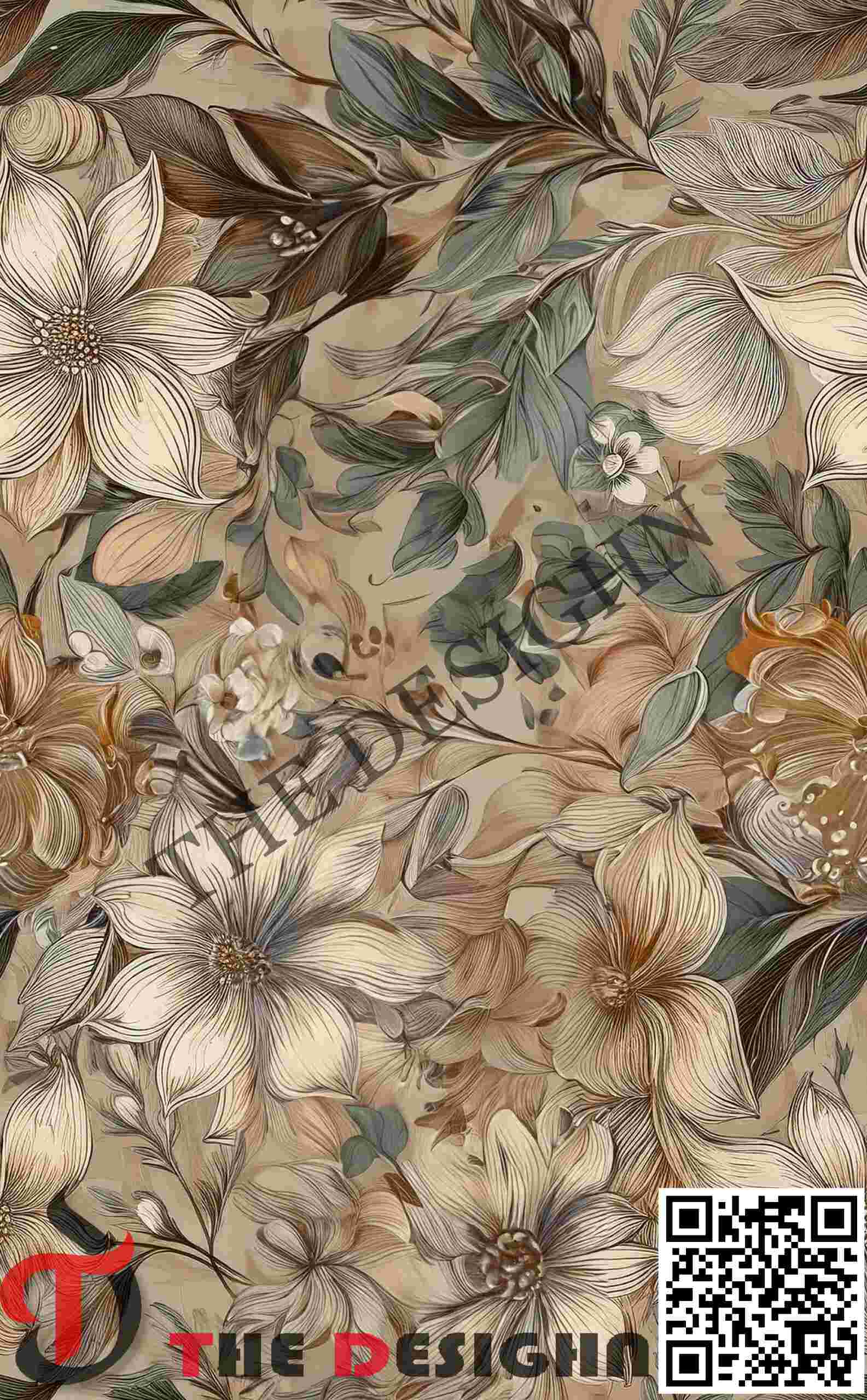 Pigment Dispersion (Zonal): The design features “Volumetric Zonal Graduation.” Within the cream flower petals, the color is dispersed in varying “densities”—from high-density dark umber at the core to light, vaporous beige at the tips—mimicking the way light falls across a three-dimensional organic form.