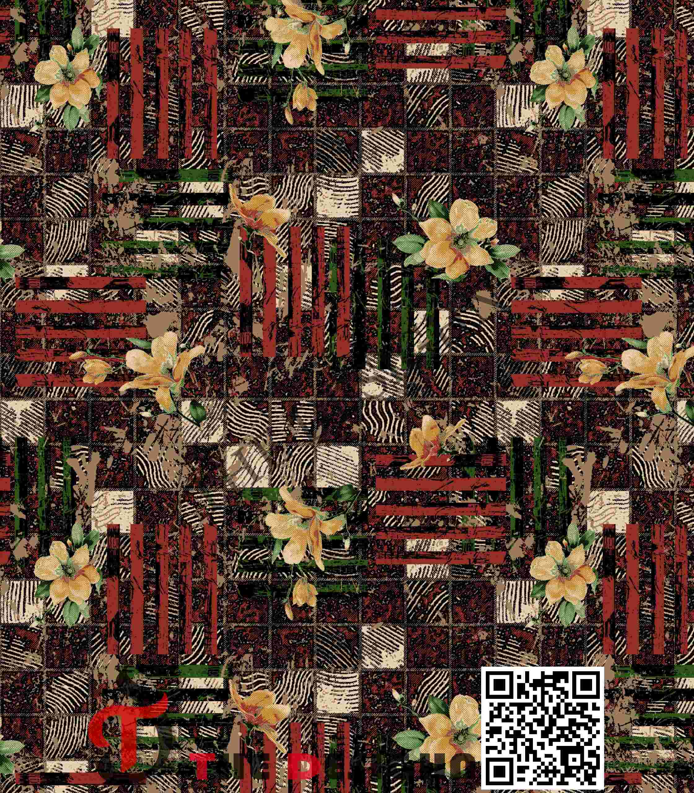 Edge Dispersion (Hard-to-Vaporous): The boundaries of the main forms feature a “Fragmented Transition”. While the flowers maintain relatively hard edges, the horizontal bars and background grid elements exhibit a “shredded” dispersion, ensuring the movement feels rhythmic and intentional, characteristic of high-precision graphic folklore studies.