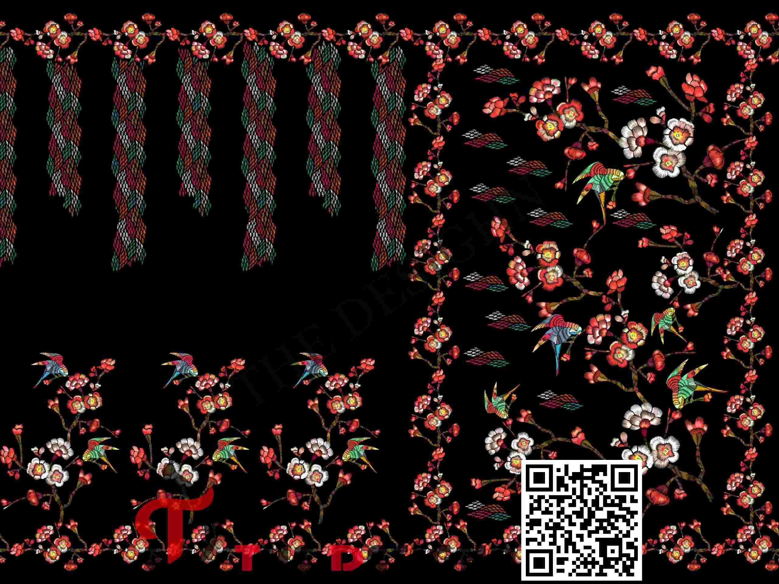 Pigment Dispersion (Zonal): The design features “Zonal Figural Graduation”. Within the avian figures and braided columns, the pigment is dispersed in varying weights—from the solid, heavy-density red and ivory of the petals to the fine, high-fidelity multi-colored “twists” in the braided tassels—creating a sense of physical material depth and 3D relief against the dark ground.