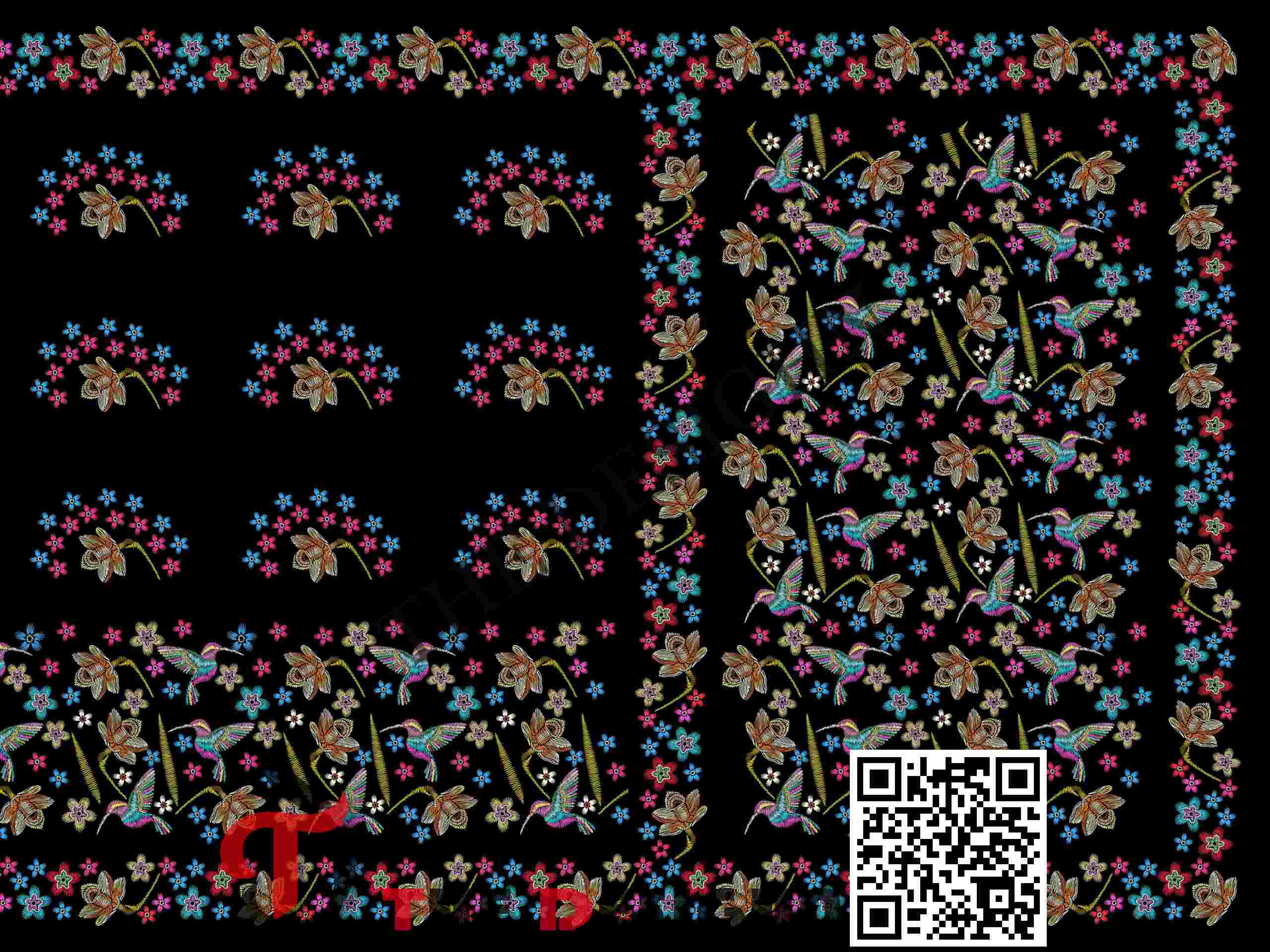Visual Dispersion (Mechanical): The design exhibits “Mechanical Surface Dispersion”. The pigments within the hummingbirds and flowers are dispersed in fine, internal “pitted” dots and stippled cells that mimic the texture of traditional Phulkari or Chikankari embroidery, providing a tactile, “needle-worked” surface quality.