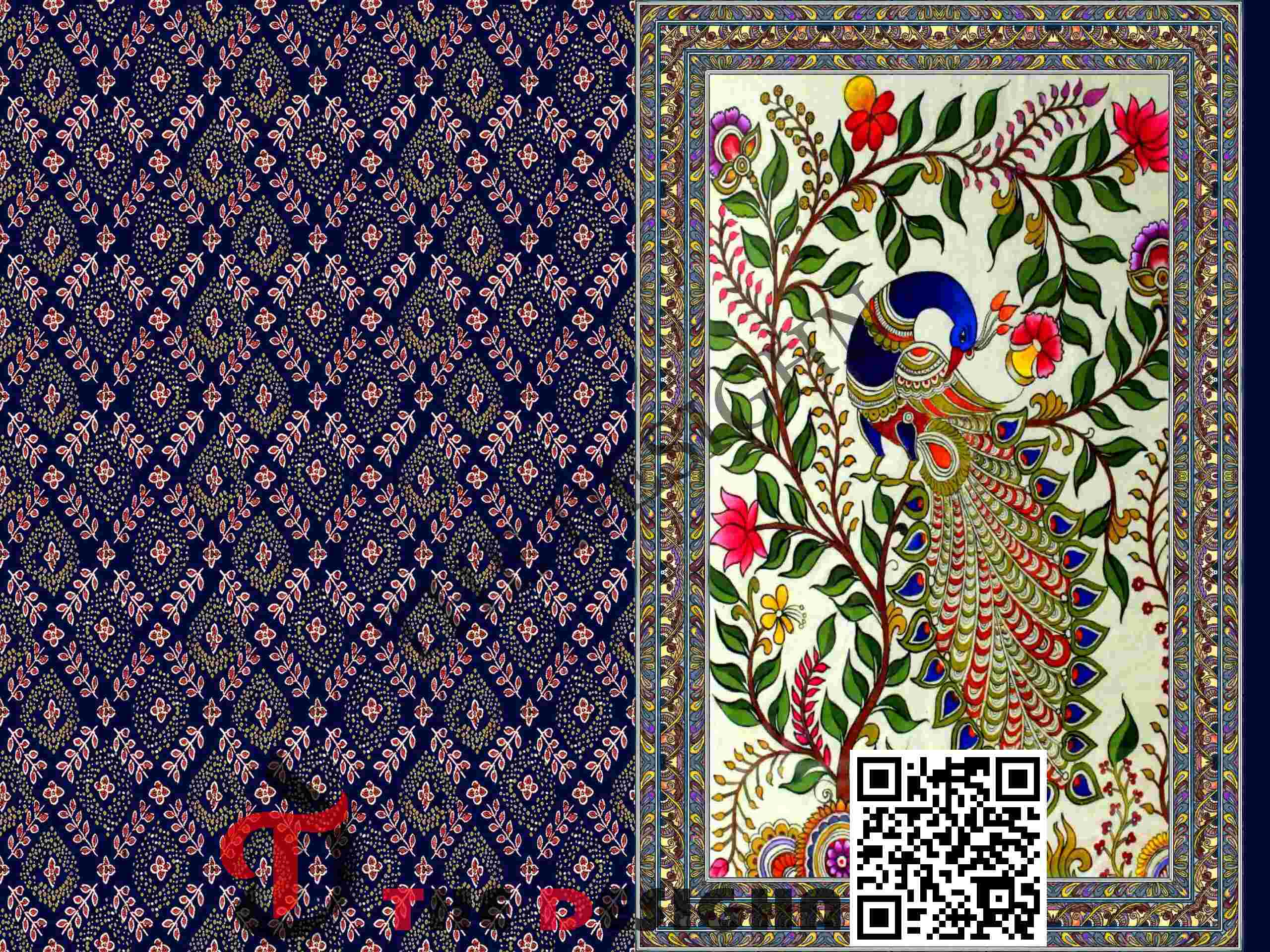 Pigment Dispersion (Zonal): The design features “Zonal Figural Dispersion”. Within the peacock panel, the pigment is dispersed in varying weights—from the solid, heavy-density blue of the peacock’s neck to the fine, high-fidelity linework in the feather “eyes” and leaf veins—creating a sense of physical material depth and 3D relief.