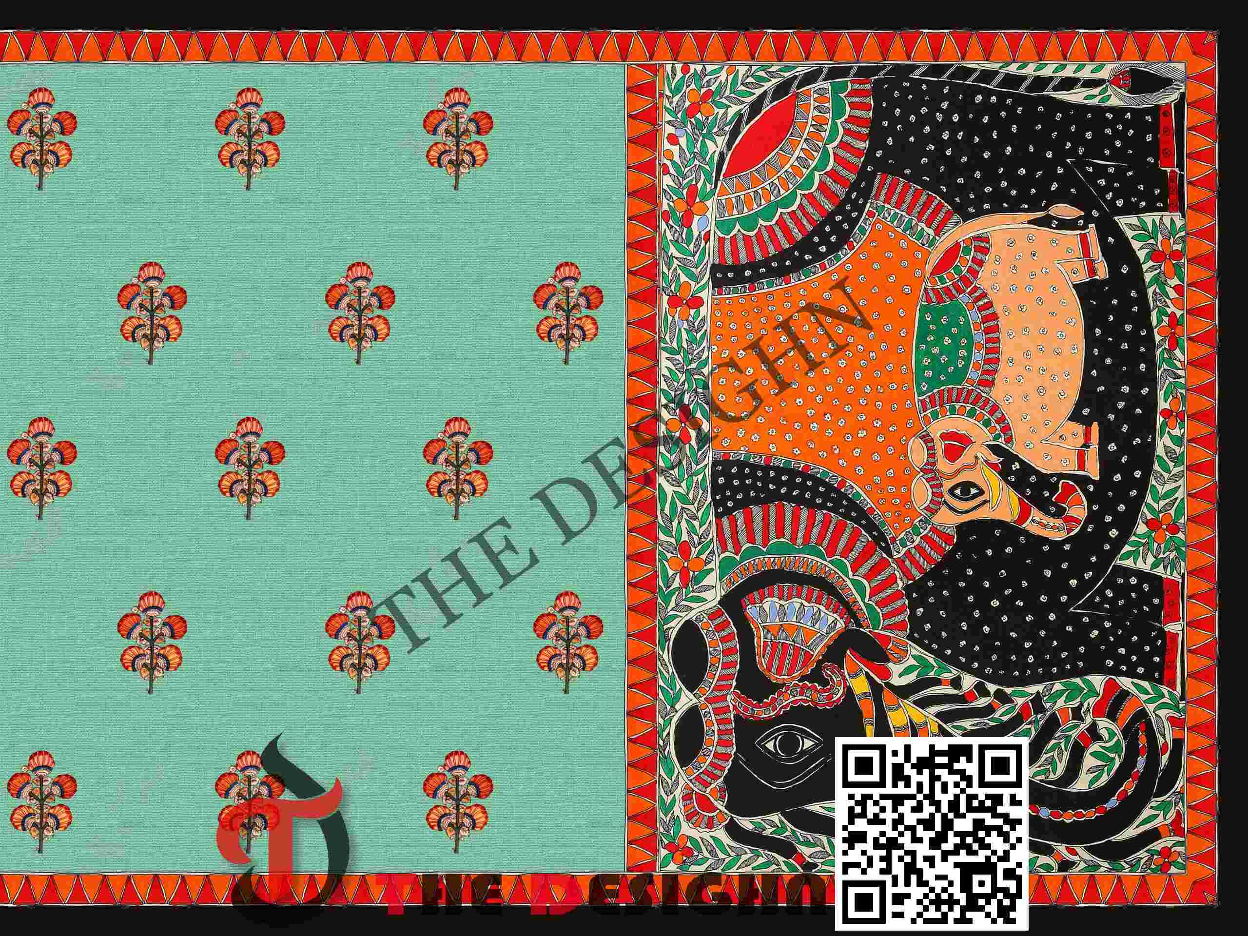 Edge Dispersion (Hard-to-Structured): The boundaries of the main forms feature a “Hard-Line Transition”. Unlike abstract or gestural studies, the edges here are not feathered; instead, the dispersion is strictly contained within bold black outlines characteristic of Madhubani art, ensuring the movement feels rhythmic, controlled, and intentional.