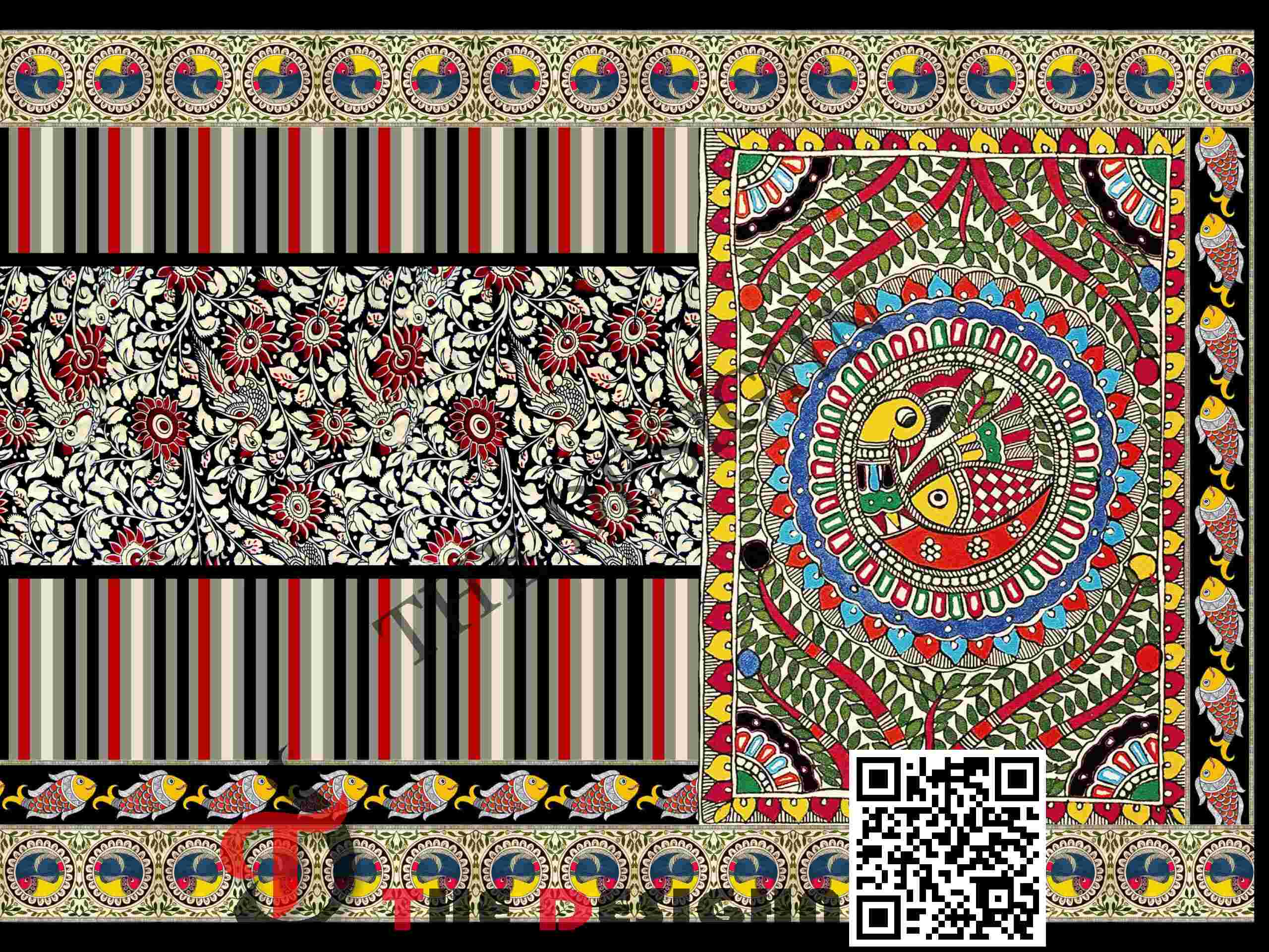 Pigment Dispersion (Zonal): The design features “Zonal Figural Dispersion”. Within the focal mandala, the pigment is dispersed in varying weights—from the solid, heavy-density red and yellow of the avian figure to the high-fidelity stippling and fine linework in the fish scales and leaf veins—creating a sense of physical material depth and 3D relief.