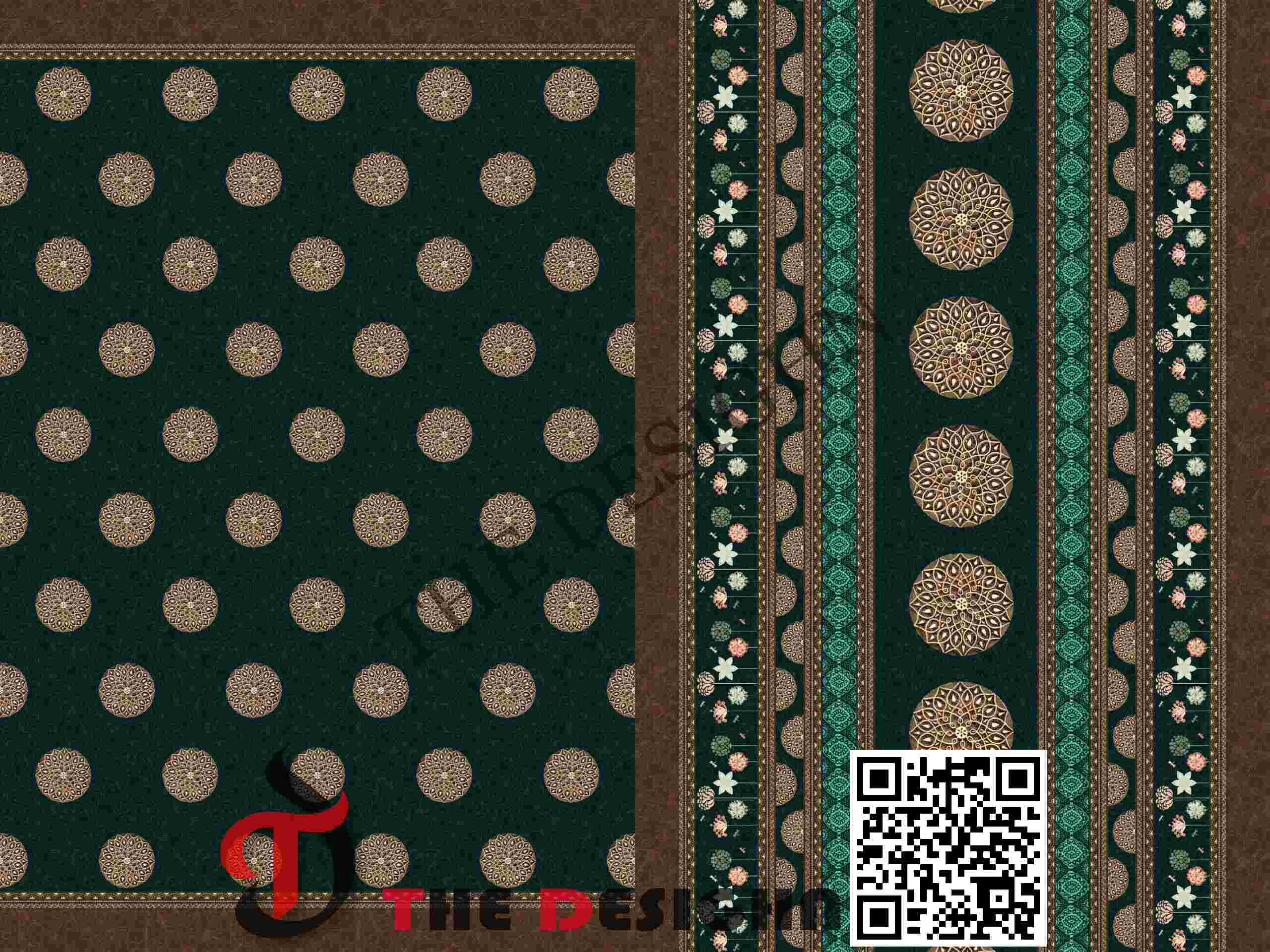 Pigment Dispersion (Zonal): The design features “Zonal Motif Graduation”. Within the vertical panels, the pigment is dispersed in varying weights—from the solid, heavy-density gold of the large mandalas to the fine, high-fidelity linework in the pinstriped background and delicate botanical borders—creating a sense of physical material depth and 3D relief.