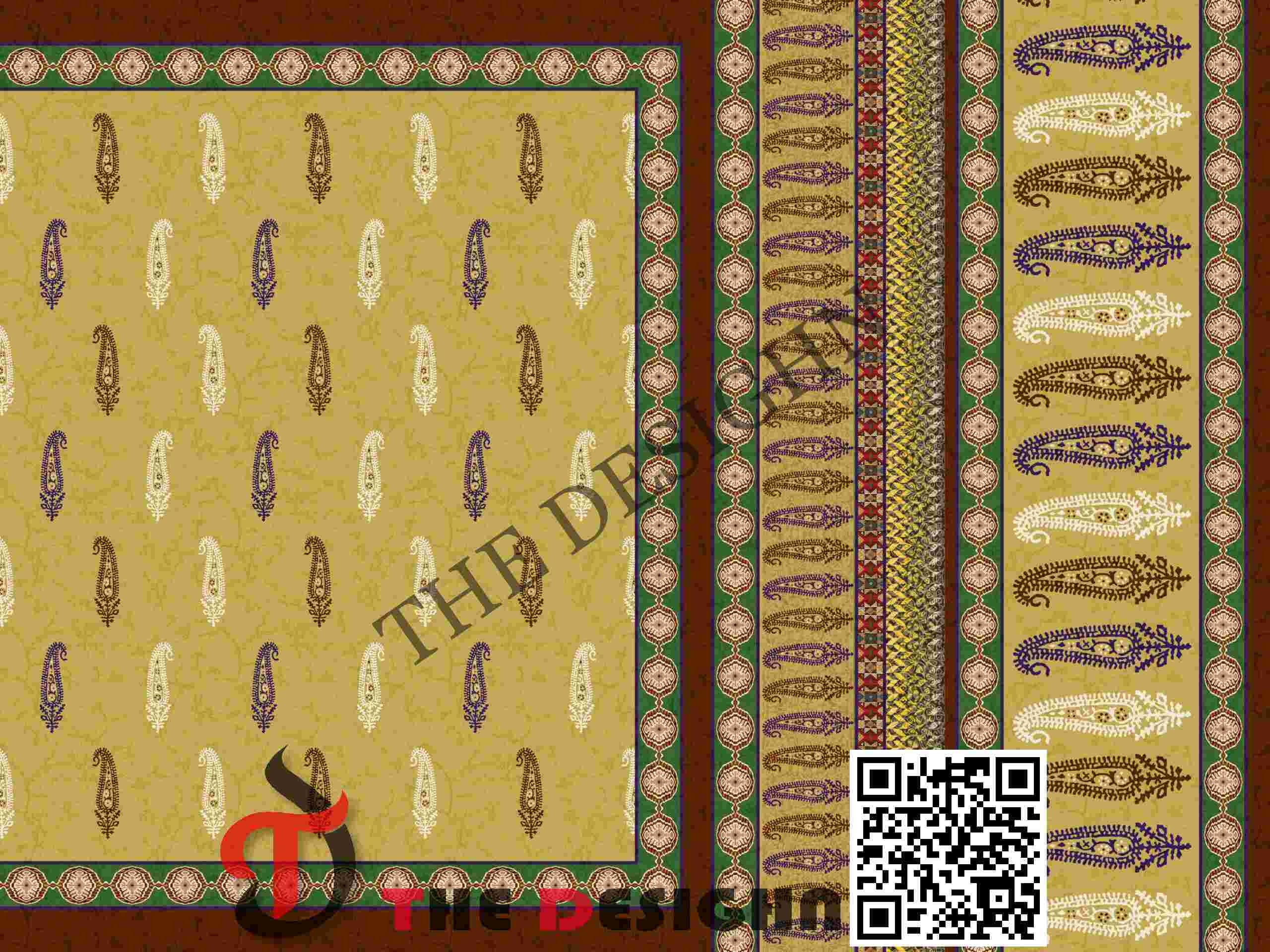 • Pigment Dispersion (Zonal): The design features “Zonal Motif Graduation”. Within the vertical panels, the pigment is dispersed in varying weights—alternating between high-density purple and emerald for the main paisleys and fine, high-fidelity stippling in the circular borders—creating a sense of physical material depth and 3D relief.