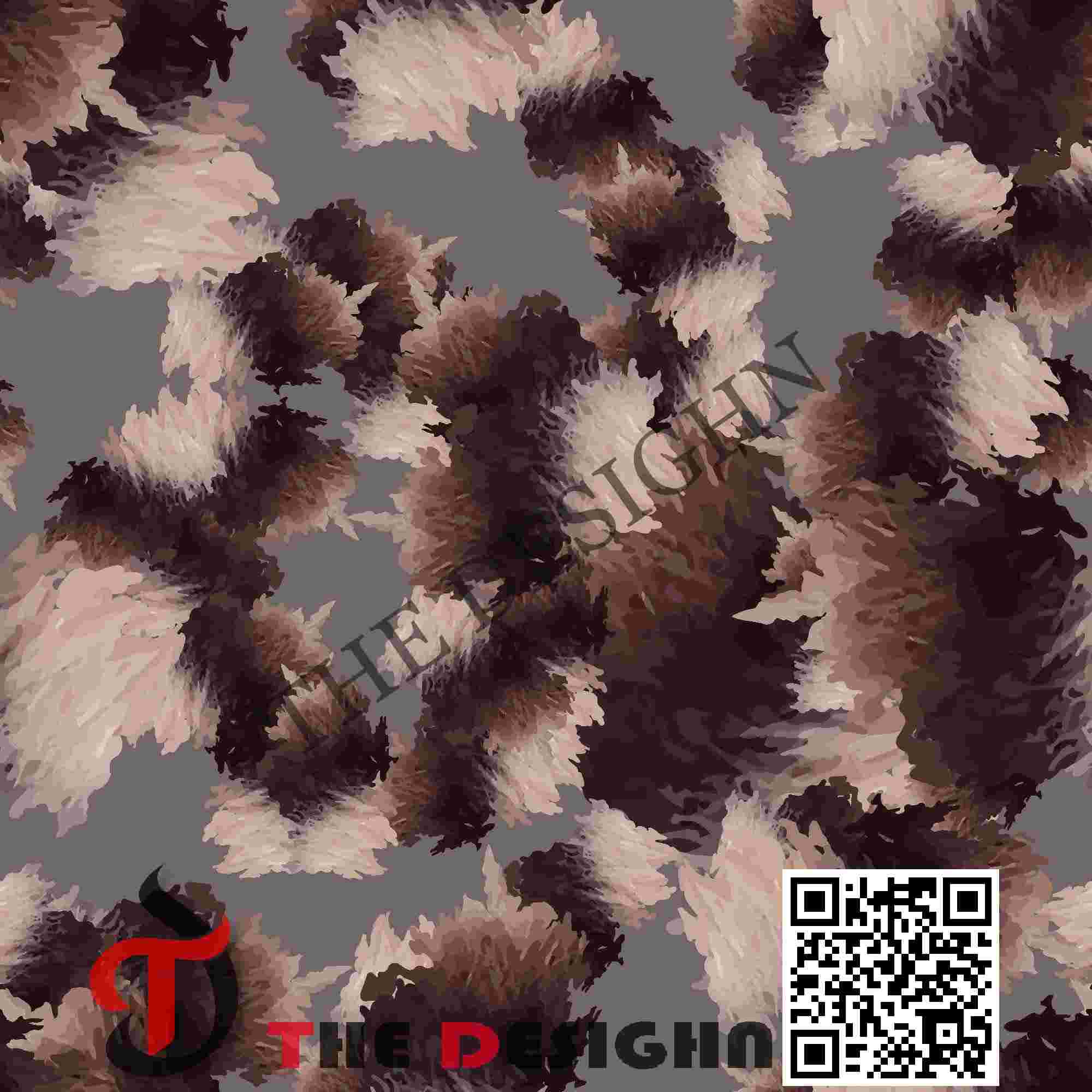 Pigment Dispersion (Zonal): The design features “Saturated Zonal Concentration.” Saturated umber pigments are dispersed in dense, opaque “knots” at the center of each motif, immediately surrounded by wide areas of highly fragmented, “shattered” sand-colored strokes that allow the background to show through.